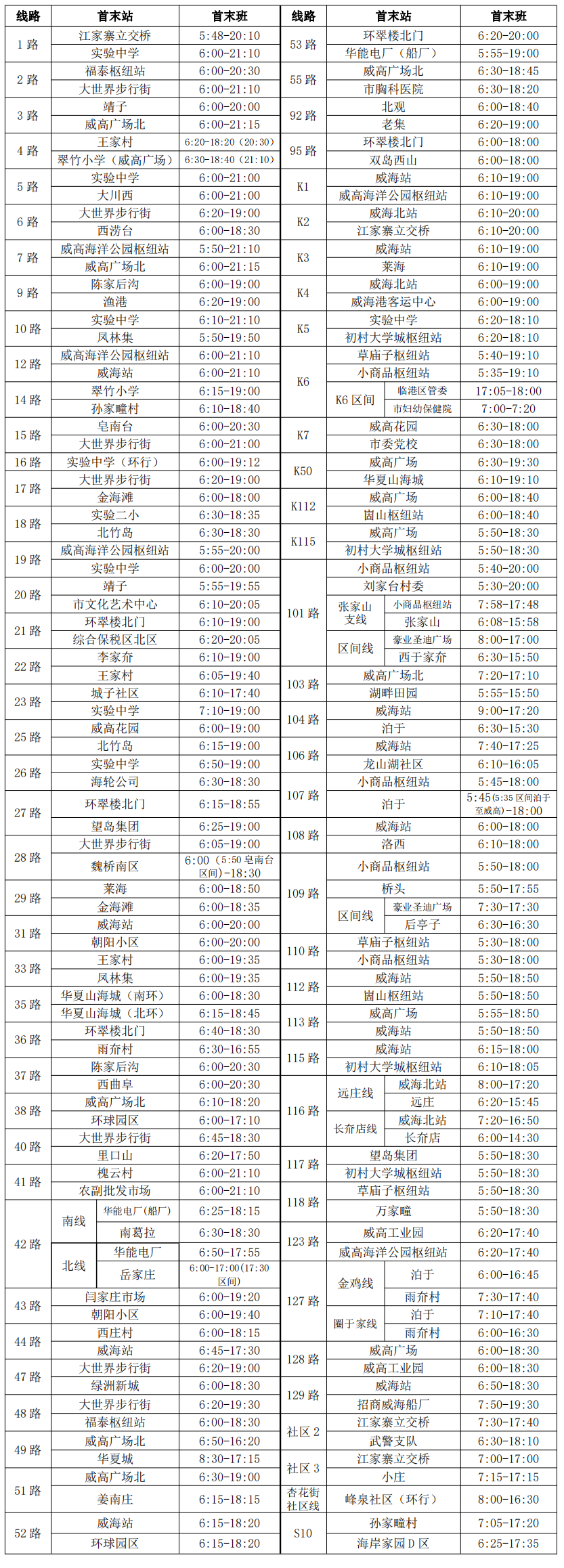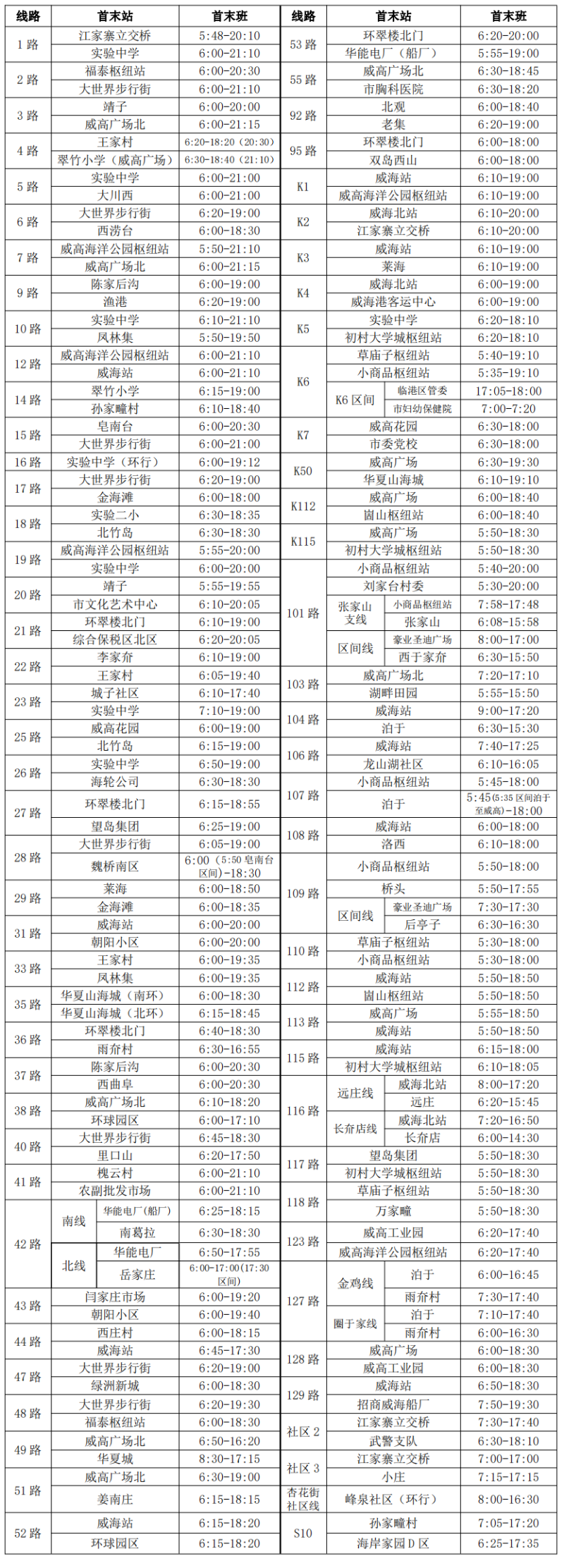 其他线路首末班发车时间不变(详见附件),具体线路营运信息请咨询5230950或通过威海公交官方APP查询。