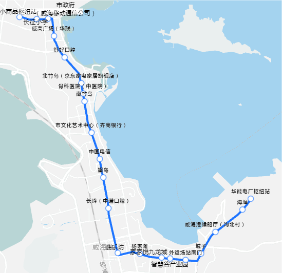 2.站点设置:华能电厂枢纽站、海埠、威海港候船厅(沟北村)、城子、外运场站南门、智慧谷产业园、家家悦九龙城、杨家滩、韩乐坊、长峰(中诺口腔)、望岛、中国电信、市文化艺术中心(齐商银行)、南竹岛、骨科医院(中医院)、北竹岛(京东家电家居旗舰店)、舒好口腔、威高广场(华联)、市政府(威海移动通信公司)、长征小学、小商品枢纽站共21站。